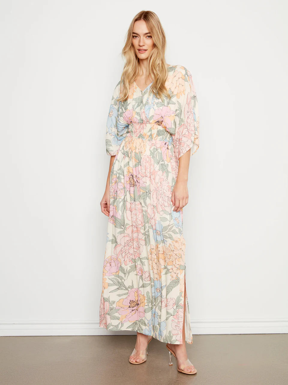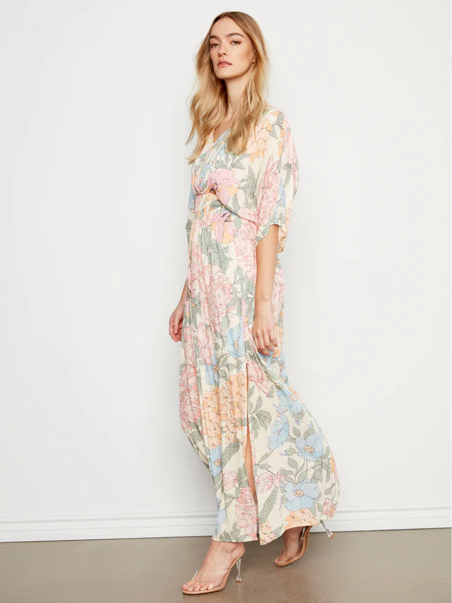 Embrace elegance all spring and summer with this Dahlia Printed Dolman Sleeve Maxi Dress. Its captivating pastel floral pattern and lightweight, breathable fabric enhance its enchanting charm. Perfect for an evening out or a seaside stroll, it catches the eye and flows gracefully with the wind thanks to its side slits.