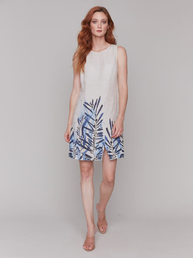 Infuse your wardrobe with tropical charm in our printed sleeveless linen-blend dress, crafted for style and ease. With its elegant design, airy fit, and stylish split hem, it's your go-to for warm, sunny days. Ideal for poolside relaxation or casual terrace lunches, this dress ensures you remain cool and chic. Make this vibrant dress your ultimate spring & summer staple.