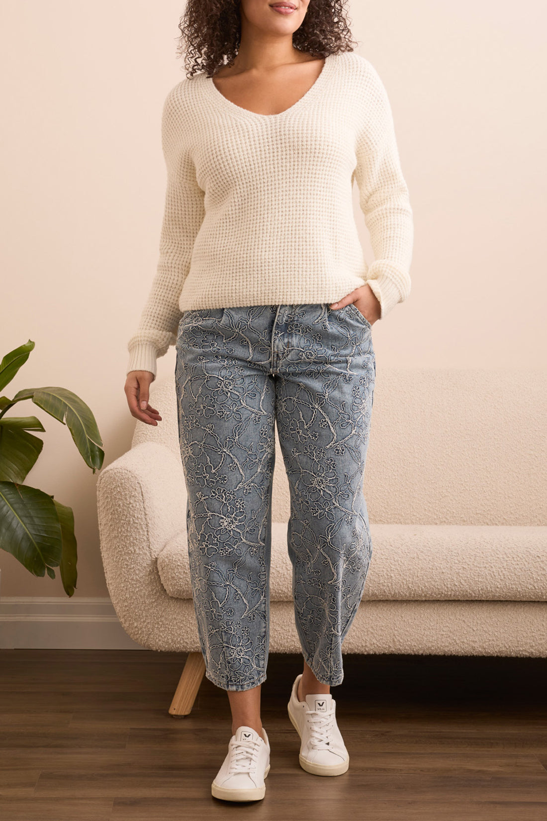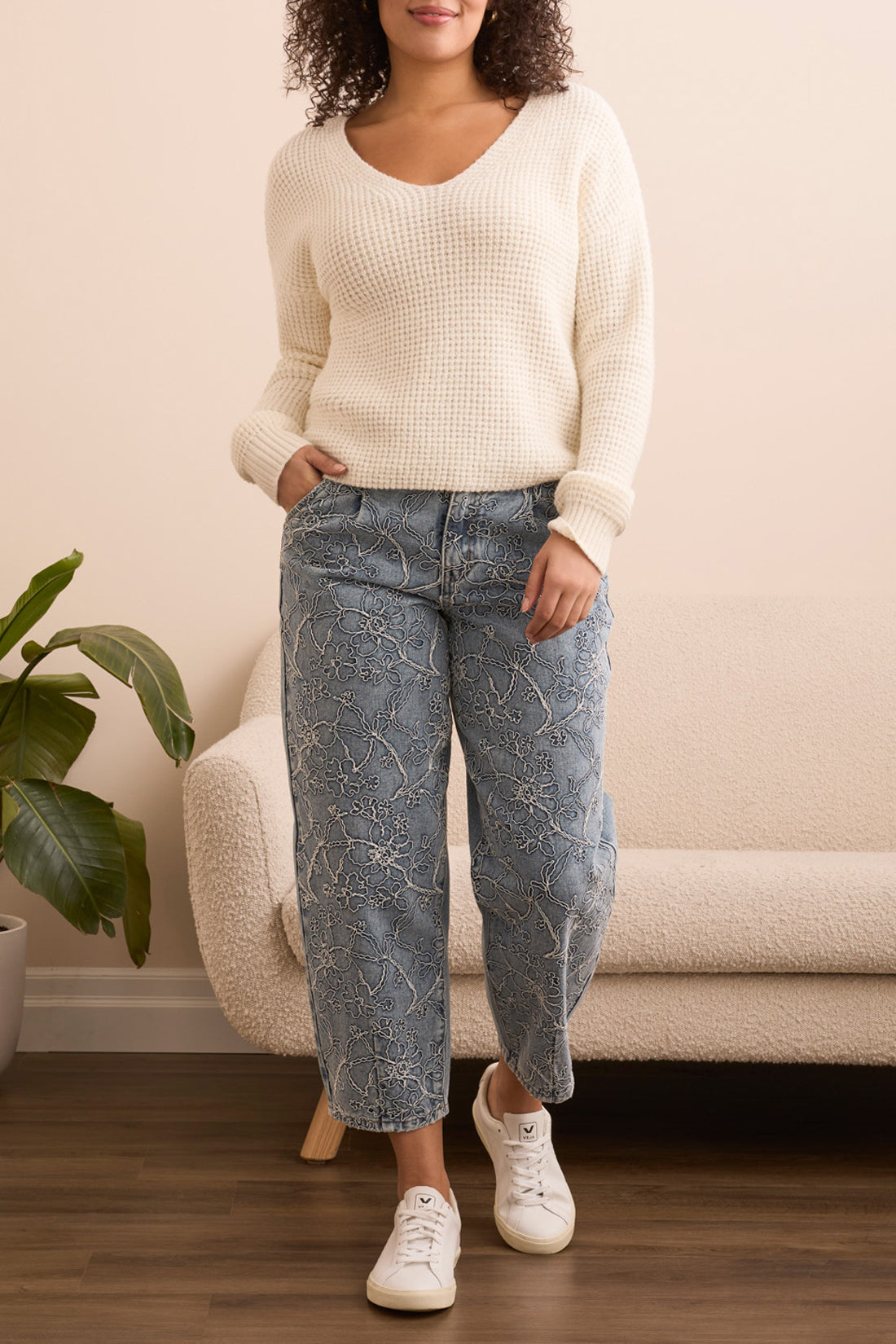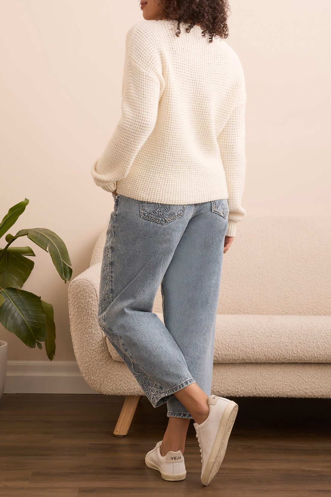 Find your new favorite in denim for fall with these medium blue wide leg jeans. Detailed floral embroidery and studs give them a chic, yet relaxed look. Made from stretch denim, they provide all-day comfort and style. Perfectly suited for both casual outings and more formal events, they bring an artistic flair to your wardrobe.