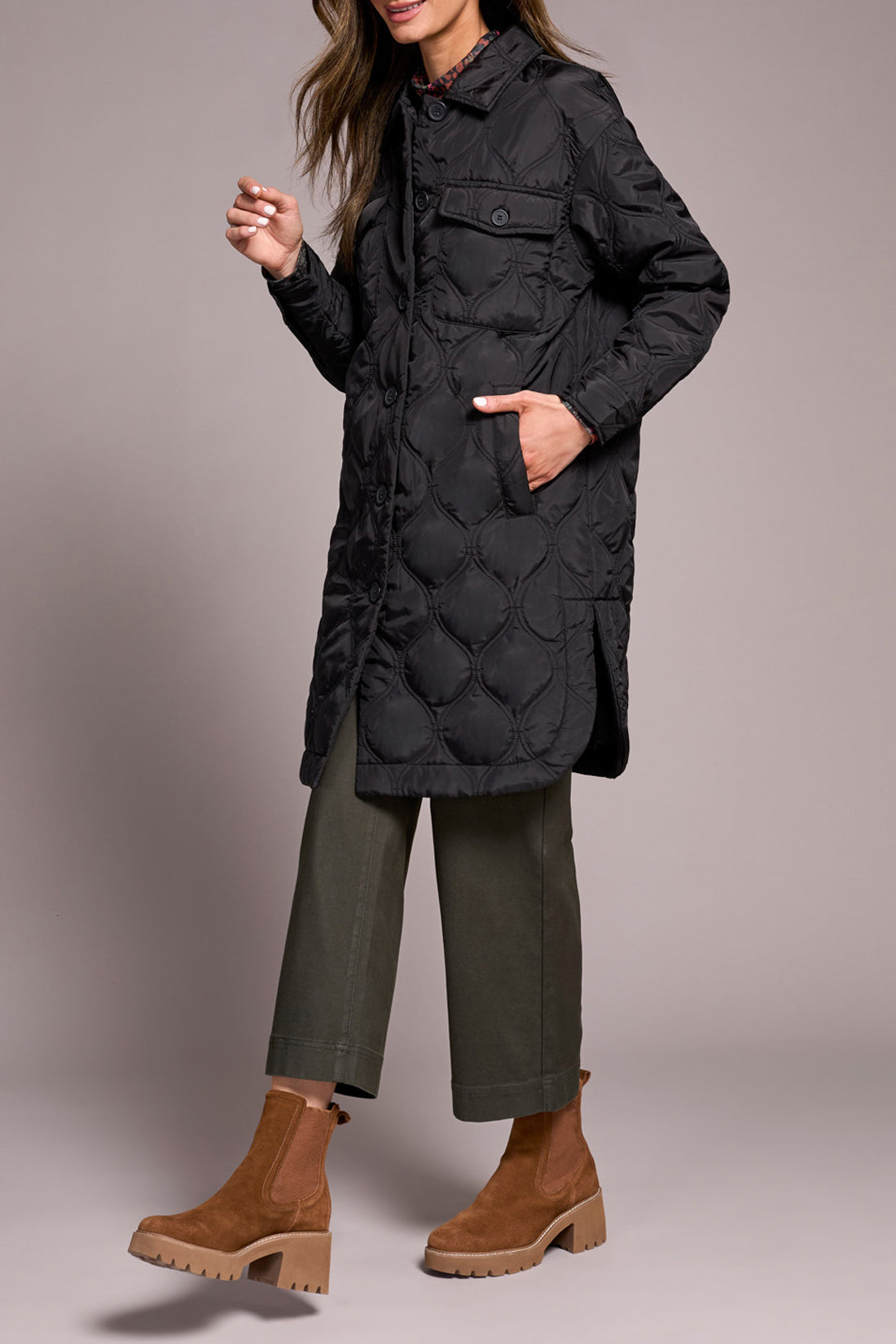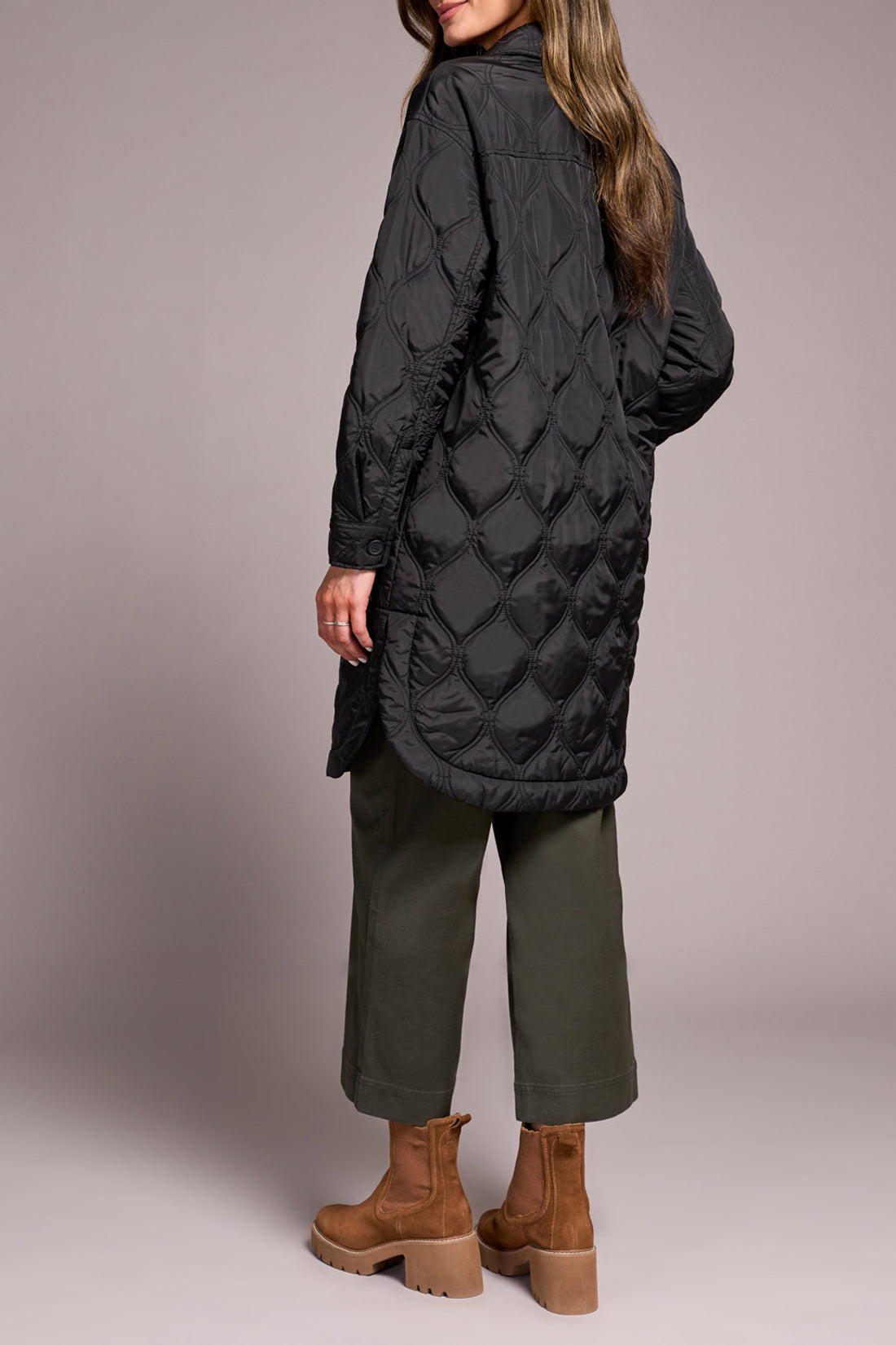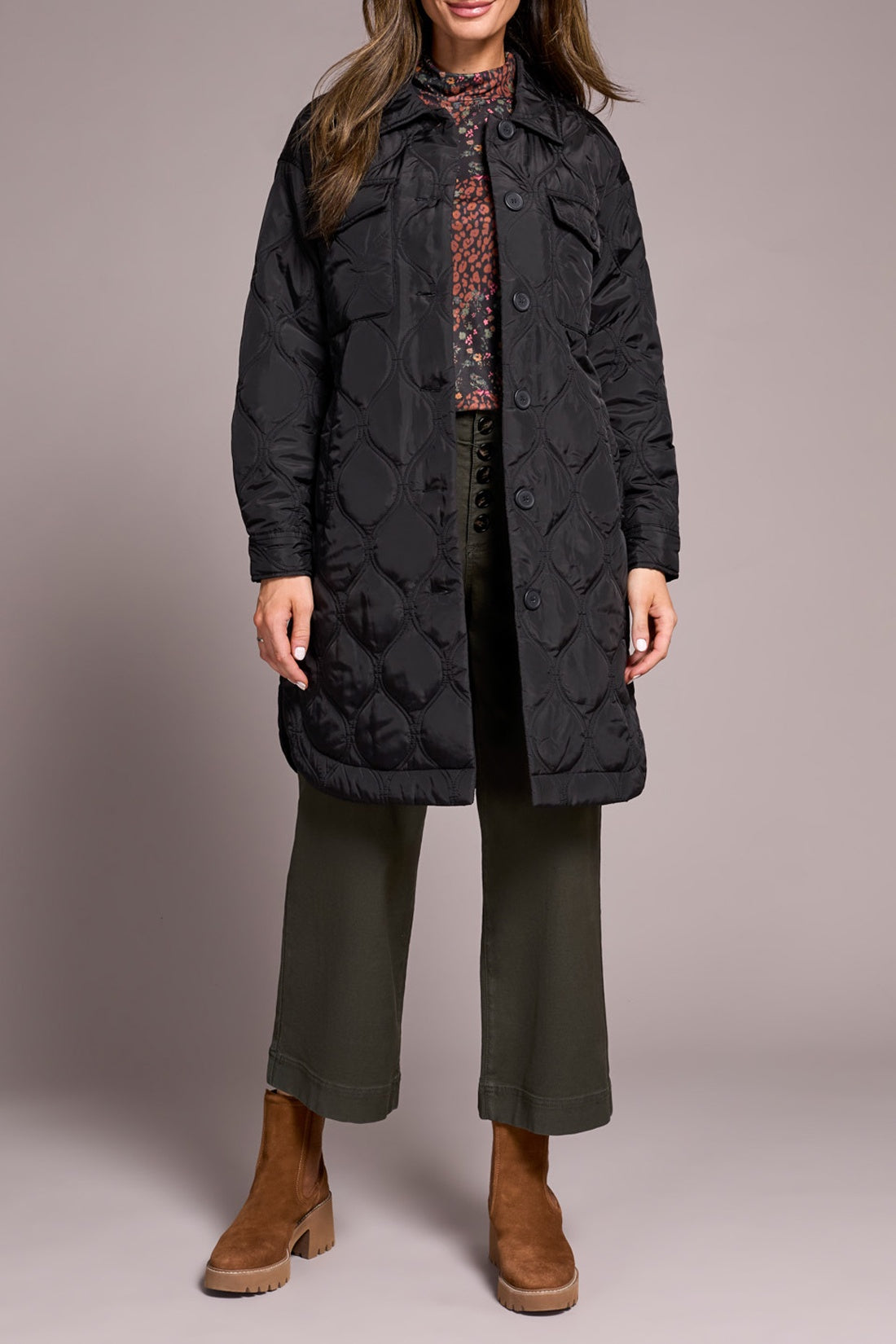 Brave chilly days with style and confidence in our sophisticated button-up jacket, featuring a cozy and stylish quilted design. Featuring timeless details such as a classic collared neckline, laid-back drop-shoulder sleeves, and practical patch pockets on the chest, along with convenient welt pockets at the sides, it effortlessly combines functionality with fashion. With a flattering 39" length, it's the perfect outerwear piece to elevate your cold-weather wardrobe.