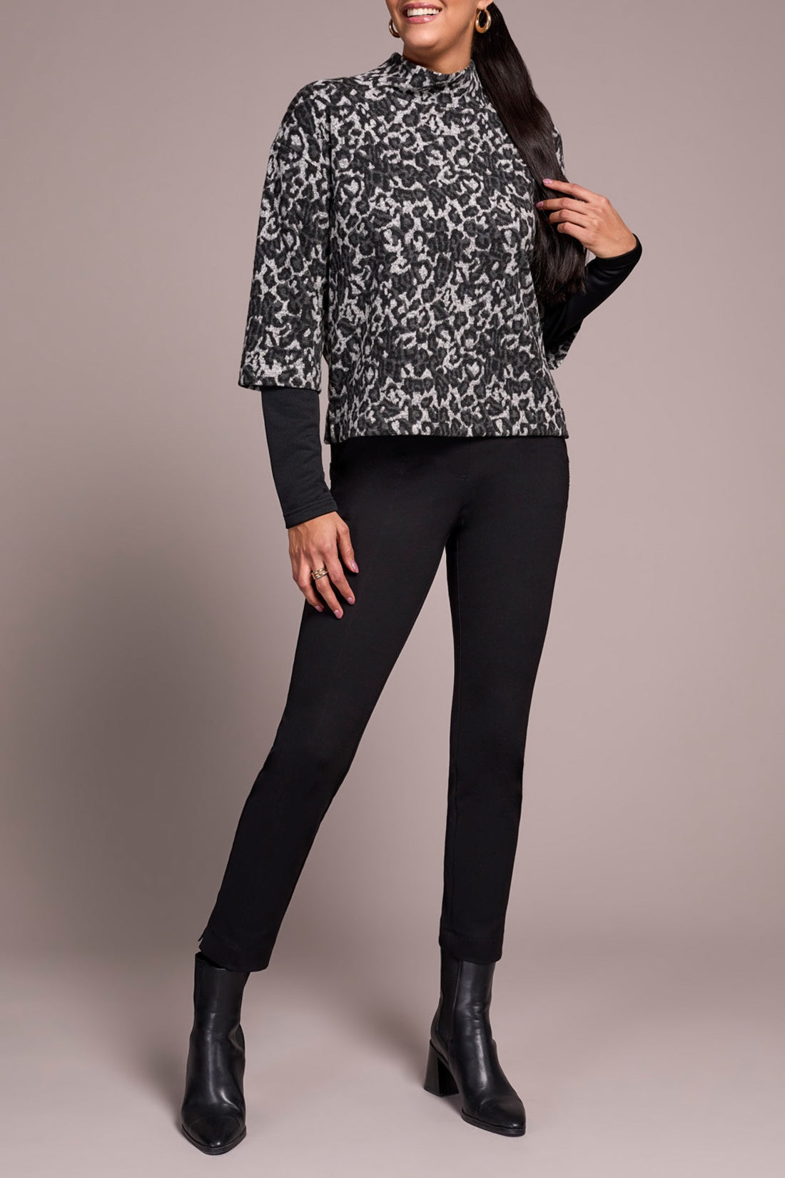 Pop-over mock neck Long raglan sleeve Long side slits Ribbed finishing at sleeve and body Heathered knit fabric
